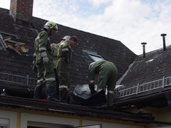 "Dach fing Feuer: Ein Hausbesitzer aus Kobersdorf verursachte am Montag einen Brand, als er eine Lüftung am WC einbauen wollte. Als ein Werkzeug Funken sprühte, fing das Dach Feuer, da es mit leicht brennbaren Materialien ausgestattet war. Vor dem Eintreffen der Feuerwehr versuchte der Besitzer, den Brand mit dem Gartenschlauch zu löschen. Die Florianis entfernten das Blechdach, um so in den Hohlraum des Spitzbodens zu gelangen und den Brand löschen zu können."