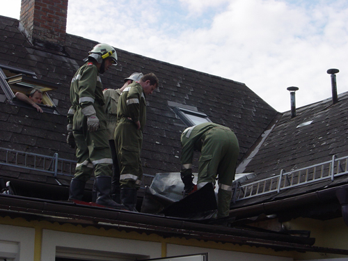 Nach dem Eintreffen vor Ort um 9:35 mit 26 Mann wurde der Schwelbrand, welcher sich in der Zwischendecke des Wohnhauses zum Spitzboden ausgebreitet hatte, lokalisiert. Durch Öffnen des Daches sowie Öffnen der Decke vom Wohnbereich aus, konnte der Schwelherd rasch eingegrenzt und ein weiteres Ausbreiten im Objekt verhindert werden.