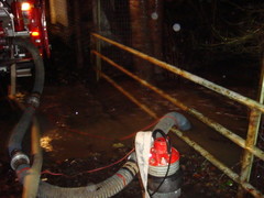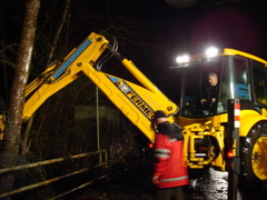Die nun über die Strasse führenden Wassermengen fanden den neuen Weg in das Bachbett über das gegenüberliegende Anrainergrundstück mit direktem Verlauf zum darauf befindlichen Objekt. Um Sachschäden abzuwenden wurde bis zum eintreffen eines Löffelbaggers zur Freilegung der Rohrquerung das Wasser mittels TS sowie Tauchpumpe ergänzend umgeleitet.