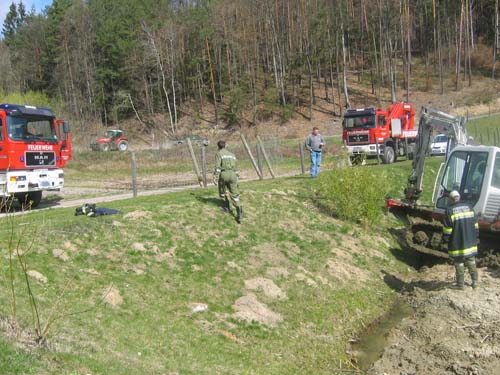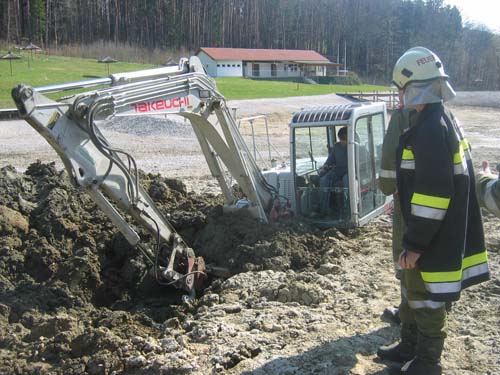 Unter Anweisung und Hilfestellung der Feuerwehr Kobersdorf mit entsprechender technischer Ausstattung konnte durch einscheren der 8t Seilwinde der Bagger wieder festen Boden unter den Ketten erlangen.