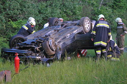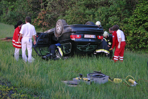 Nachdem sich das Fahrzeug mehrmals überschlagen hatte, kam es mit zerstörter Frontpartie und eingedrücktem Dach auf selbigem zu liegen.