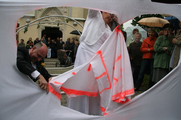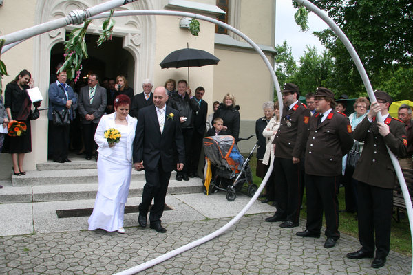 Die Kameraden der FF-Kobersdorf ließen es sich trotz des leichten Regens nicht nehmen, das frisch getraute Brautpaar nach der kirchlichen Eheschließung zu überraschen. Nach den Glückwünschworten durch OFK OBI Gerhard Klafsky wurde dem Ehepaar noch ein kleines Hindernis in den Weg gestellt, welches das Ehepaar mit Bravour meisterte. Die Ortsfeuerwehr überreichte anschließend noch ein kleines Rätsel-Präsent.