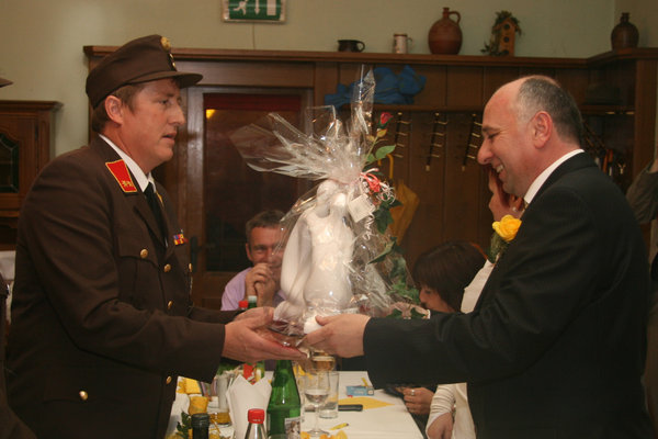 Am Abend durfte die Mannschaft dem Brautpaar gratulieren und übergab eine handgefertigte Keramik-Skulptur. Beim so genannten Kutscherspiel wurde die Hochzeitsgesellschaft noch etwas körperlich und geistig gefordert. Anschließend ließen die Feuerwehrkameraden das Brautpaar hochleben.