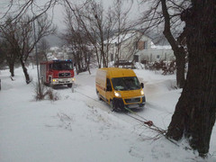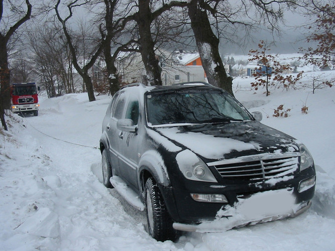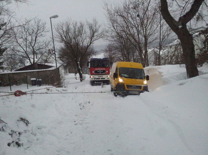 Daraufhin rückten zwei Mann mit dem RLFA 3000 zur angegebenen Adresse aus. Die Lageerkundung ergab folgendes Bild: Der Kastenwagen rutschte auf schneeglatter, teilweise zugewehter Fahrbahn rückwärts in den ca. 50 cm tiefen, von Schneewechten verdeckten Straßengraben und konnte aus eigener Kraft weder vor noch zurück. Da die Straße an dieser Stelle nur einspurig ist und von einer steilen Böschung einerseits und dem Straßengraben auf der anderen Seite begrenzt ist, konnte die Stelle von keinem Fahrzeug mehr passiert werden.