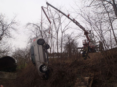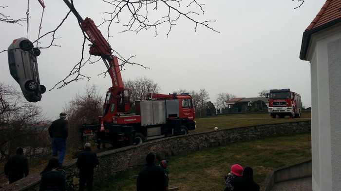 Die Alarmierung der FF Kobersdorf erfolgte telefonisch. Nach Eintreffen an der Unfallstelle wurde der Einsatzleiter auf das Fahrzeug aufmerksam gemacht, da es vom Friedhofsweg aus gar nicht zu sehen war! Wegen der Entfernung zur befestigten Straße musste mit dem Kranfahrzeug über eine abschüssige, feuchte Wiese zum abgestürzten PKW gefahren werden. Dabei wurde das Kranfahrzeug mittels Seilwinde des RLFA 3000 gesichert. Danach konnte der KRAN in Stellung gebracht werden und das Auto mittels Hebetraverse ohne weitere Beschädigungen geborgen werden. Wegen des feuchten Untergrundes konnte das Kranfahrzeug trotz Allradantriebes nicht mehr aus eigener Kraft zurück auf die befestigte Fahrbahn gelangen und musste mit der Seilwinde herausgezogen werden.