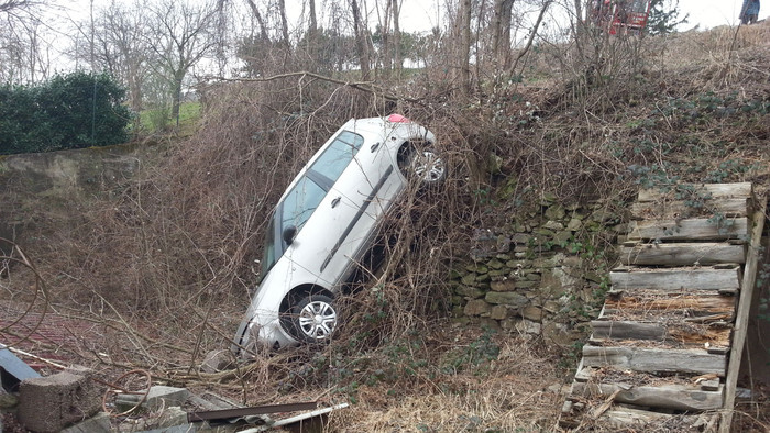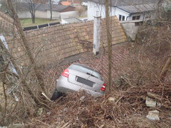 Leider vergaß sie dabei, die Handbremse anzuziehen oder einen Gang einzulegen. Nach dem Aussteigen aus dem Auto setzte sich dieses daher von selbst in Bewegung. Alle Versuche das Fahrzeug zum Stillstand zu bringen scheiterten. Somit rollte der PKW gut 40 Meter über eine Wiese und stürzte dann kopfüber über eine Böschung auf ein Privatgrundstück. Dort blieb er mit der Front im Blechdach eines Nebengebäudes stecken...